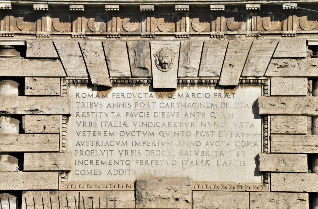 A commemorative inscription in Latin celebrates the opening of the water supply brought by the Marcio Aqueduct into Rome’s distribution network, inaugurated in 1923. Not only does the text celebrate the beneficial and healthful effects of the newly completed work, it also mentions the ancient origins of the aqueduct, the construction of which was ordered by the Roman praetor Quintus Marcius Rex in 144 BC. This was one of the longest in the city at 94.4 kilometres and its water was considered by Pliny the Elder to be the best on earth for its freshness and wholesomeness, a gift from the gods to the city.