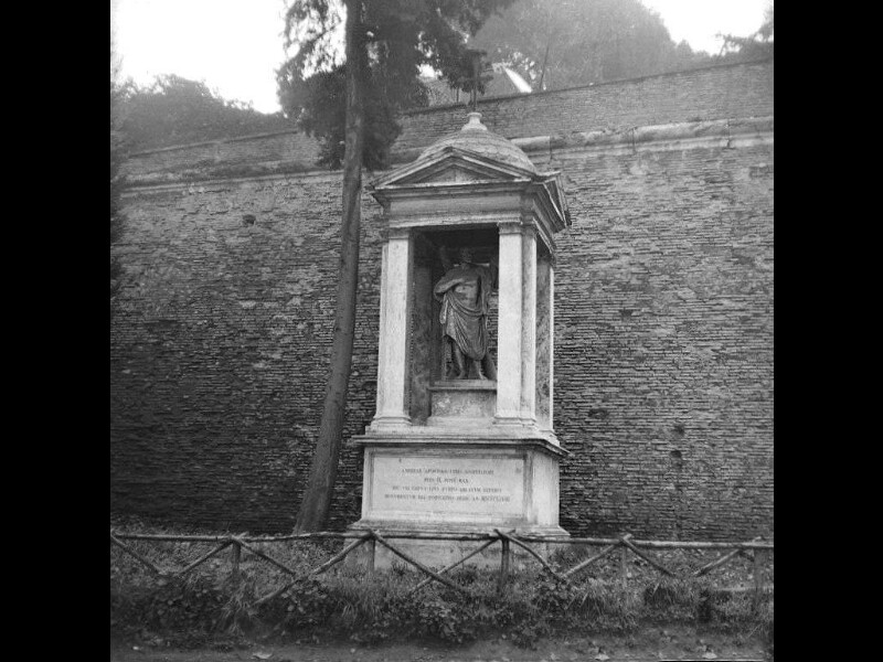Once around the first bastion on the left from the gate (the ninth) the wall houses a travertine aedicule, containing the statue of St Andrew, commissioned by Pius IX to commemorate the spot where the relic of the saint’s head was found, stolen in 1848 from St Peter’s Basilica, and rediscovered here about a month later.
