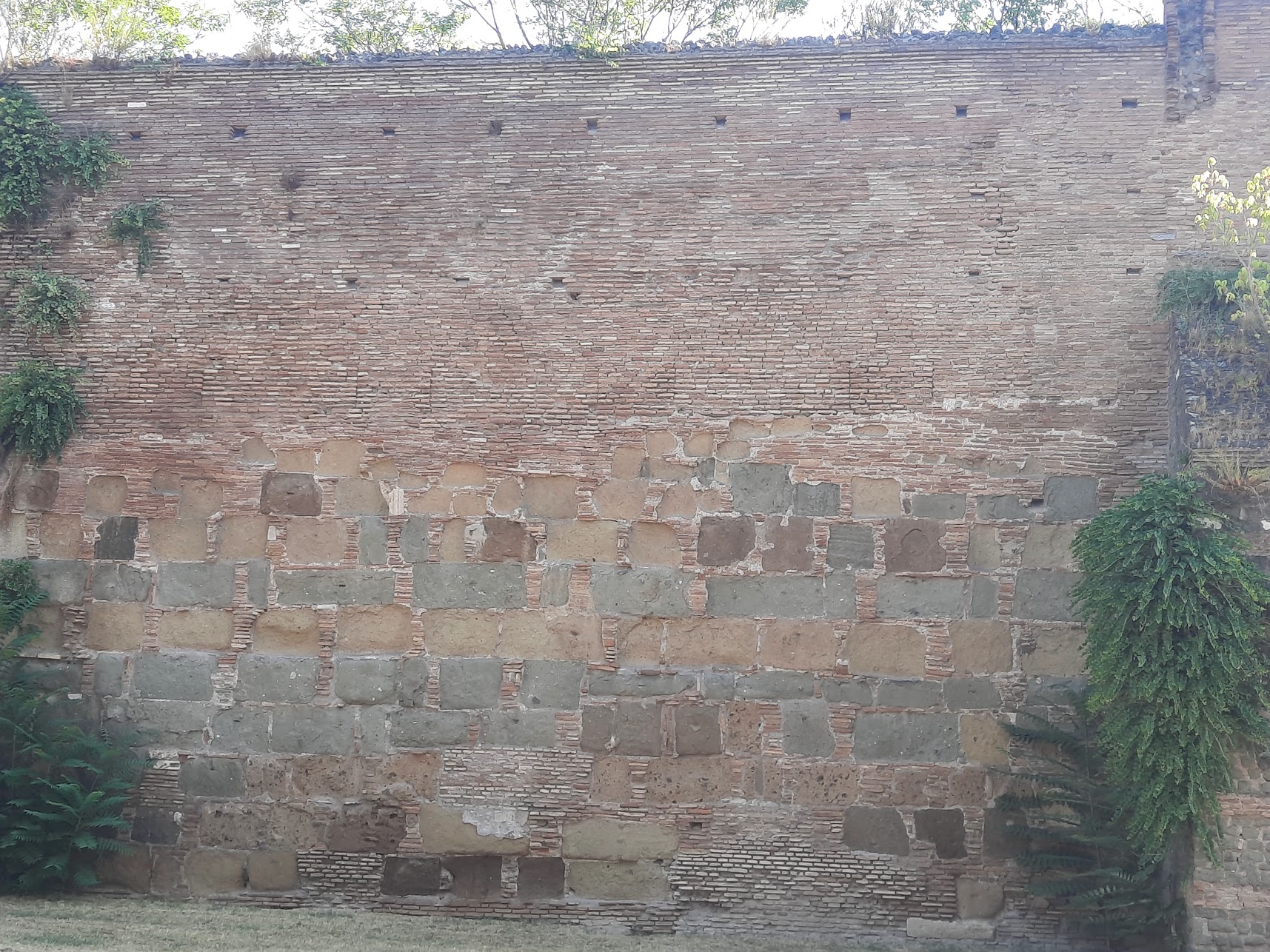 Once past the Ardeatine Bastion, two spans of the outer elevation of the Walls preserve Aurelian masonry with traces of the battlements that later disappeared with the heightening of the walls by Honorius. In the lower part of the first span, the Aurelian curtain wall rests on a 19th century restoration, recognisable by the use of light yellow bricks, the accuracy of the technique and the surface grouting of the mortar beds. In the following span lower down, a large section in reused tuff blocks, with the addition of rows of bricks to level the layers, can be traced back to a medieval restoration.
