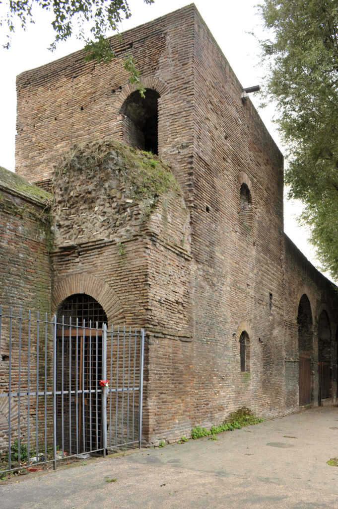 Further along, on the side facing Via Ipponio, a tower features tuff blocks in the lower part and bricks above. Inside are two stacked rooms connected by a central staircase. The original Honorian tower was likely restored in the early Middle Ages, as indicated by the masonry technique. From 1939, it was used as an artist’s studio, first by architect Remo Riti, then, in the 1960s-70s, by painter Saviniano Salvator, architect Pio Chiaretti, and finally the Mexican artist Fidelio Gonzales, who carpeted the stairs and floors according to the fashion of the time.