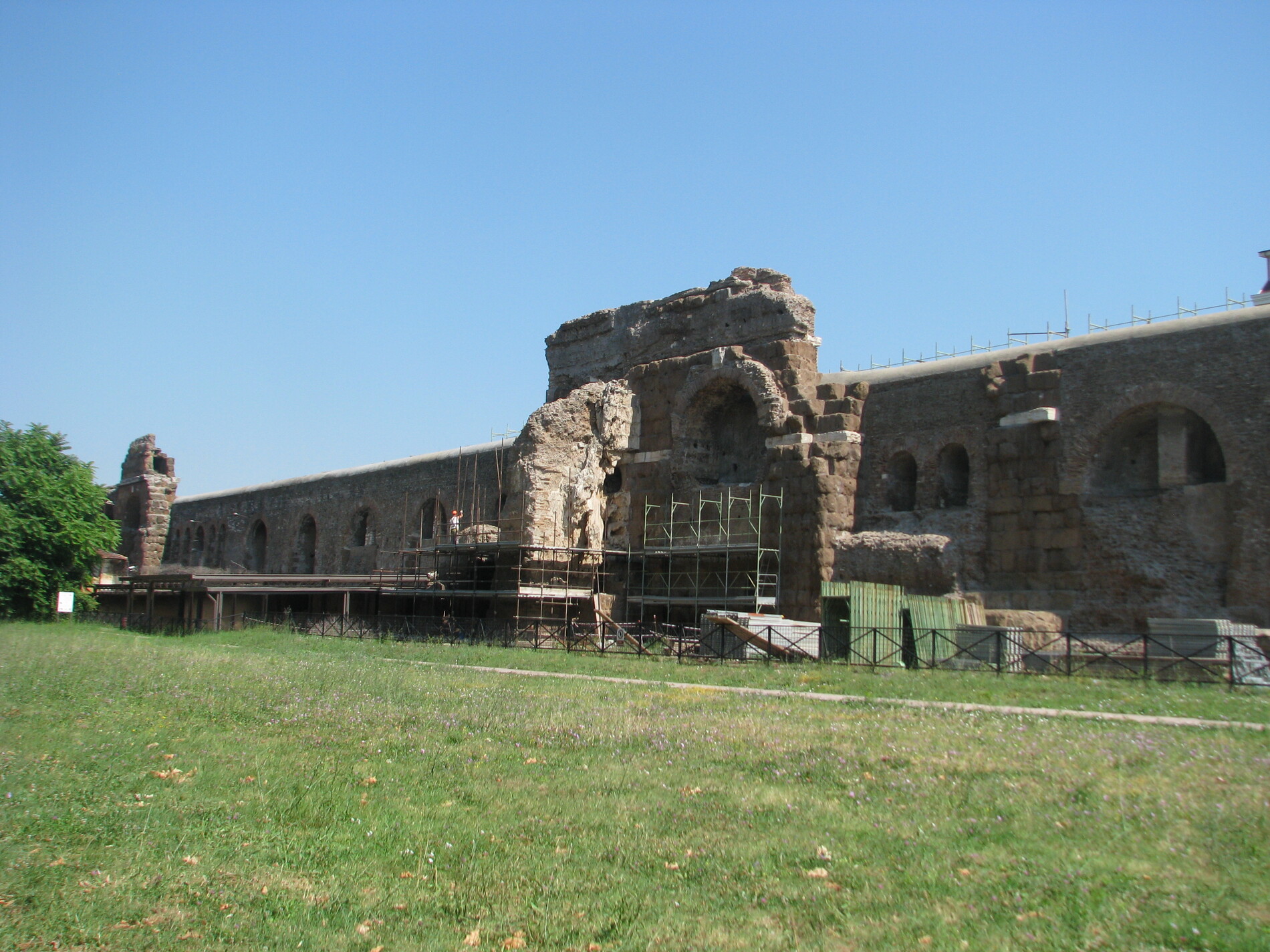 Inside the complex of Santa Croce in Gerusalemme, the Felice aqueduct is clearly recognisable. The structures in front, on the other hand, are related to a sumptuous domus excavated between 1959 and 1962. The visible remains are related to formal or state entertainment areas, with large rooms decorated in painted plaster and mosaics and a private part with smaller rooms dating back to the 4th century.