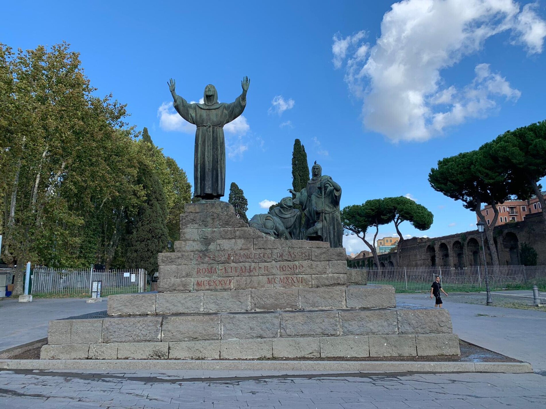 The monument to St Francis of Assisi (1181/82-1226) in Piazza di Porta San Giovanni was built on the initiative of the Committee for the celebrations of the Saint, planned in 1926 on the occasion of the 7th centenary of his death. The execution of the work was entrusted to the Marche sculptor Giuseppe Tonnini (1875-1954). The bronze sculptural group depicts the Saint and five friars, the companions who in 1210 followed him on the journey from Assisi to Rome for the recognition of the first Rule by Pope Innocent III (1198-1216). The two inscriptions with Dante’s verses from the 11th canto of the Paradiso celebrating the saint, run along the eastern and northern elevations of the base, while the dedicatory epigraph is on the main face.