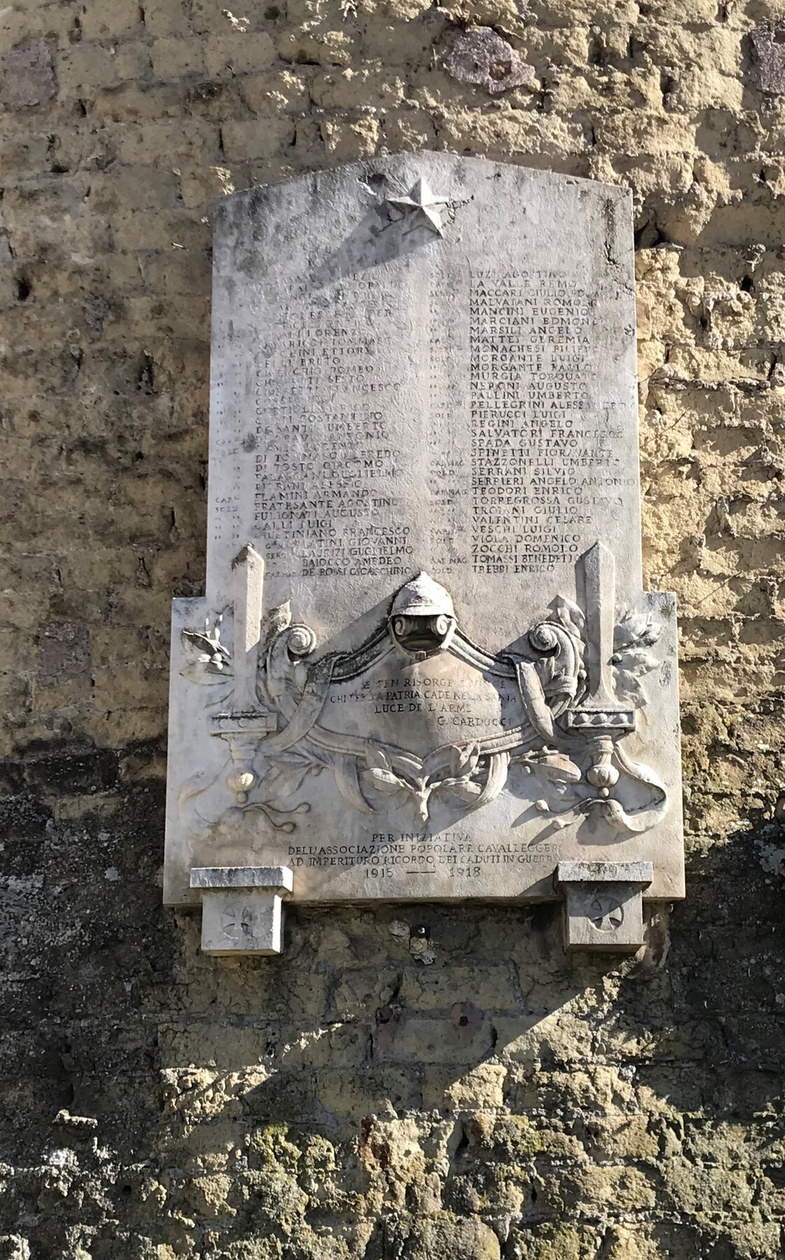 The plaque was placed on the Leonine Walls on 7 August 1922 in memory of those killed in the First World War. Engraved on the lower part, on a scroll surmounted by a helmet and flanked by two swords, are some verses by Giosuè Carducci taken from the poem Bicocca di San Giacomo (1891) from the collection Rime e ritmi.
