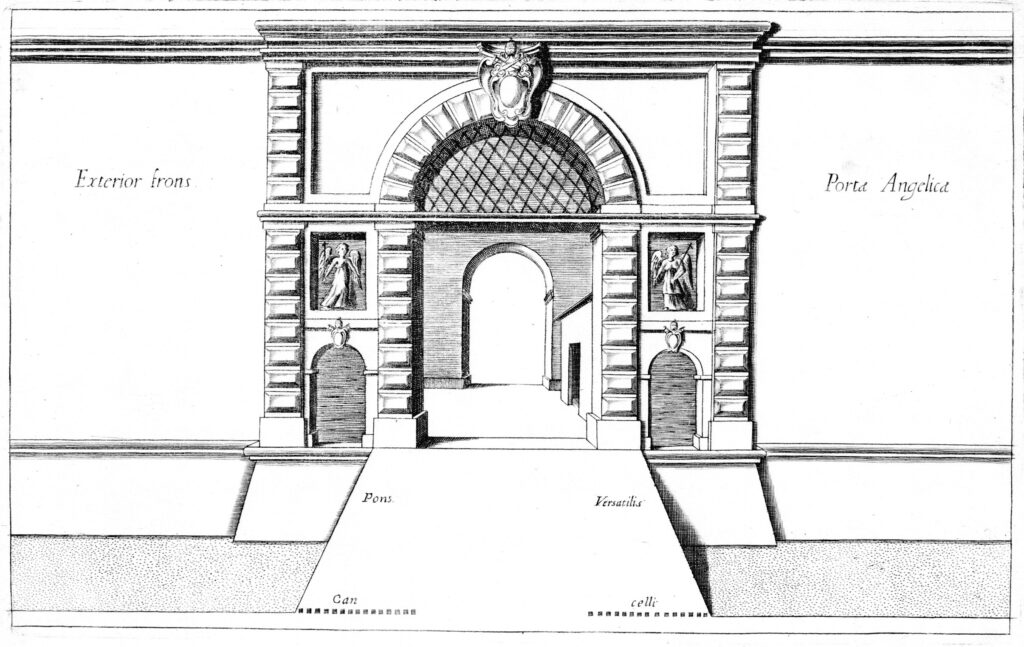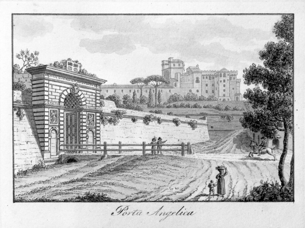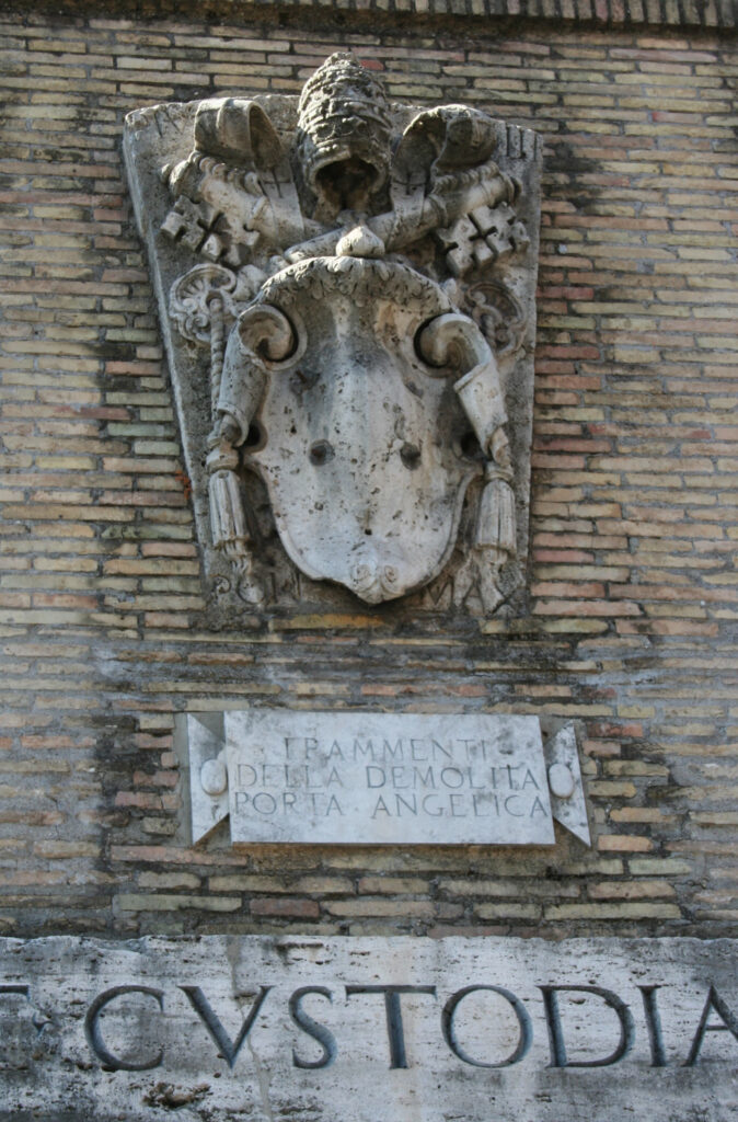 Traces of the architectural decoration of Porta Angelica can still be seen today, set into the section of the Vatican Walls on the corner with today’s Piazza Risorgimento, between the Bastione del Belvedere and the new ring of walls restored in 1929 when the borders of the Vatican State were redefined.
