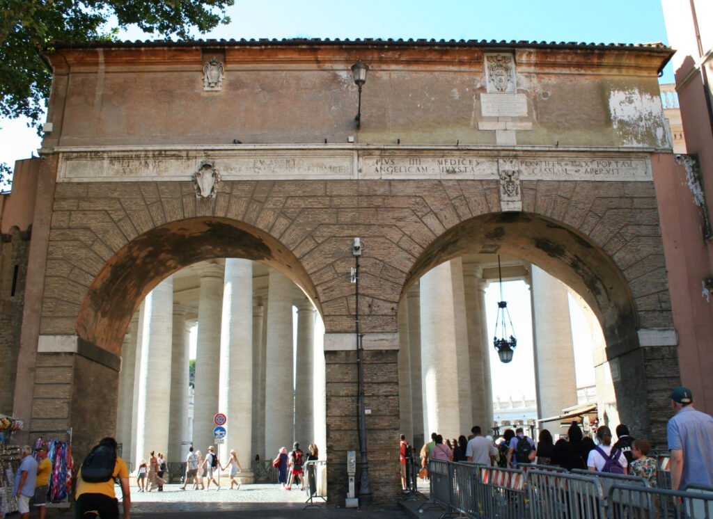 The gate currently known as Porta Angelica, situated near the colonnades of Saint Peter’s, is in fact the two-arched gateway along the course of the Passetto di Borgo (the elevated passage linking the Vatican City to Castel Sant’Angelo. One of the two archways dates to the papacy of Pius IV, and was opened when the original gate was built in 1563, while the second one was added in 1933 and bears the coat of arms of the city council.