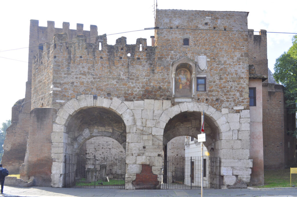 One of the best-preserved gates in the Aurelian Walls, it was opened next to Porta Raudusculana in the Servian circuit of walls. The gate was already known as the Porta Ostiensis in the 4th century AD and was later also called Porta Sancti Pauli, due to the proximity of the basilica of San Paolo Fuori le Mura, to which it was linked by a long portico. In its early life the gate had two entrances faced with cut stone and flanked by semicircular-plan towers. Passing through the west archway was the Via Ostiense, while the eastern one, on the inner side of the city, gave rise to the Vicus Portae Raudusculanae. During the time of Emperor Maxentius, a secondary inner gateway was added, also with two archways, by building two pincer-shaped walls. In the same period, the bases of the towers were also refaced with the typical opus vittatum (parallel horizontal courses of tuff alternating with bricks) and two sets of stairs leading to the attic and the patrol walkway were built at the ends of the walls of the secondary inner gateway. A second storey was also probably added in this period. Under Honorius, the external gate was reduced to just one arch; the portcullis chamber was enlarged and six windows added for illumination. The towers were increased in height, reinforced on the outside with blocks of travertine and given a third storey. On the outside, the various floors were marked by cornices made from marble corbels and brick courses.