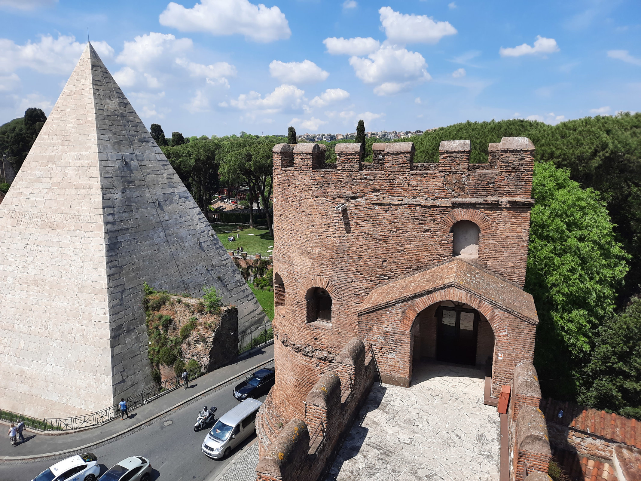 Porta Ostiense is associated with many historic events. Among the most important is the entrance into Rome of Totila’s Goths following the betrayal of the Isauri in AD 549, and the fighting that followed the armistice of 8 September 1943, when civilians and Italian troops tried to prevent the Nazi-Fascist occupation of Rome. Plaques commemorating the events of the Resistance are affixed to the section of wall flanking the Pyramid.