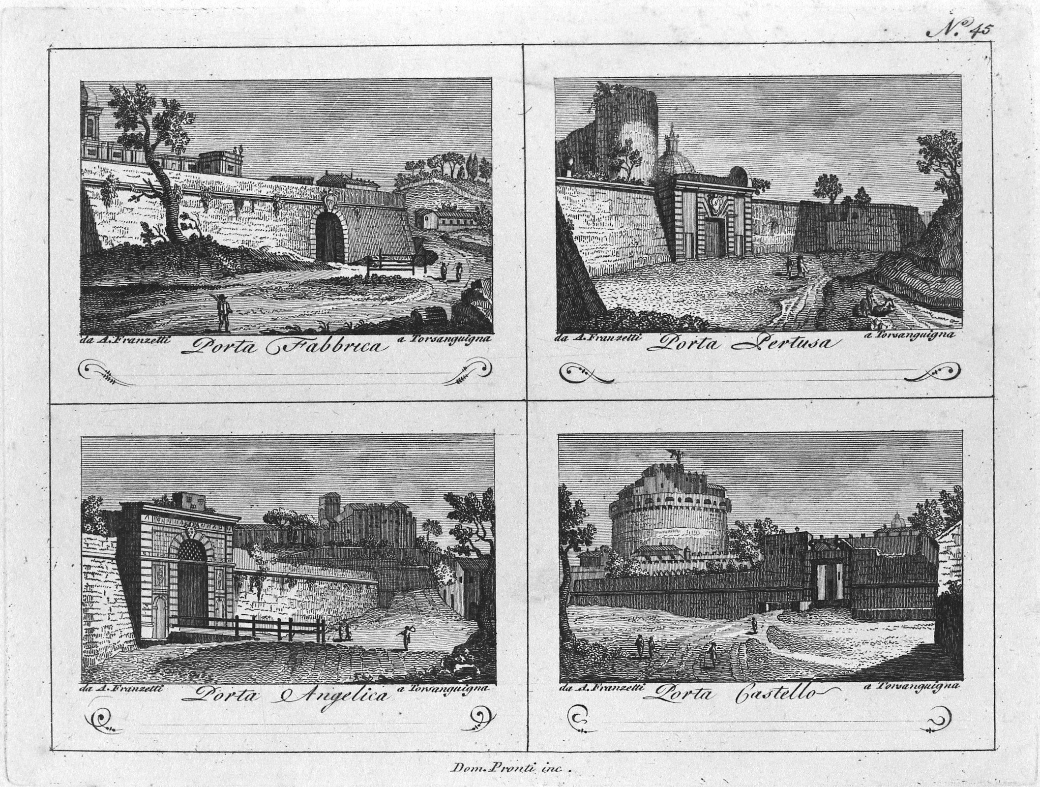 It is a large gateway with an architrave and two small side entrances framed by a double pair of pilasters in smooth ashlars. It is still possible to see the Medici coat of arms above. The gate was the preferred entrance for those coming from the Via Aurelia and led to Via delle Fondamenta, behind the apse of the basilica of Saint Peter’s. It had already been walled up by 1655 but was opened again when Queen Christina of Sweden visited Rome incognito. In 1832, the year when Luigi Ricciardelli’s print was produced, the two side entrances of the gate, erroneously identified as Porta Fabbrica, were once again walled up.