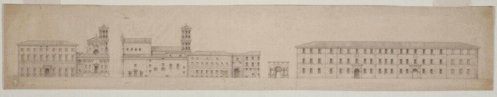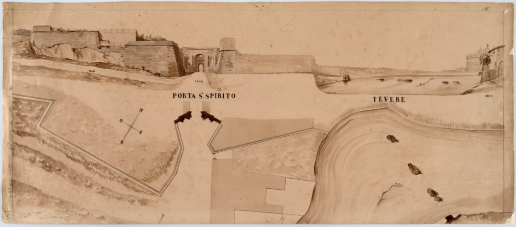 3. Borgo Santo Spirito: elevation of the gate and of the Ospedale Santo Spirito, first half of the 19th century, drawing.