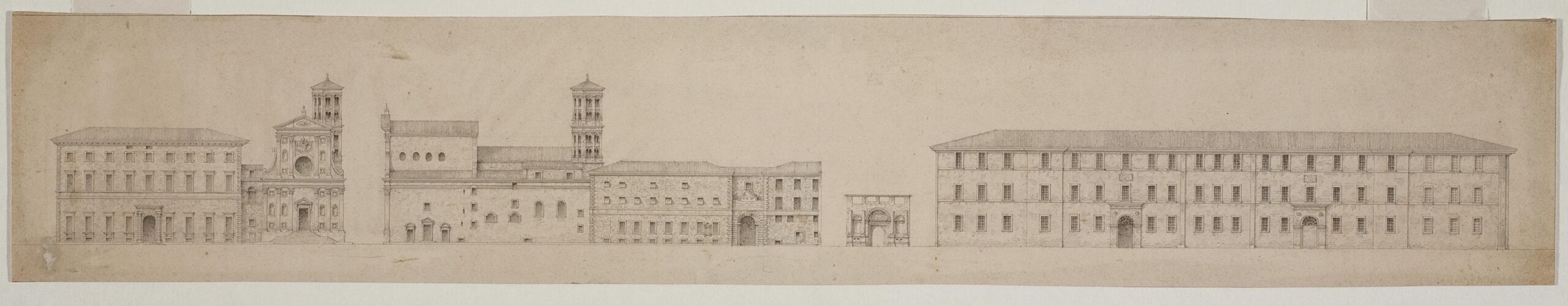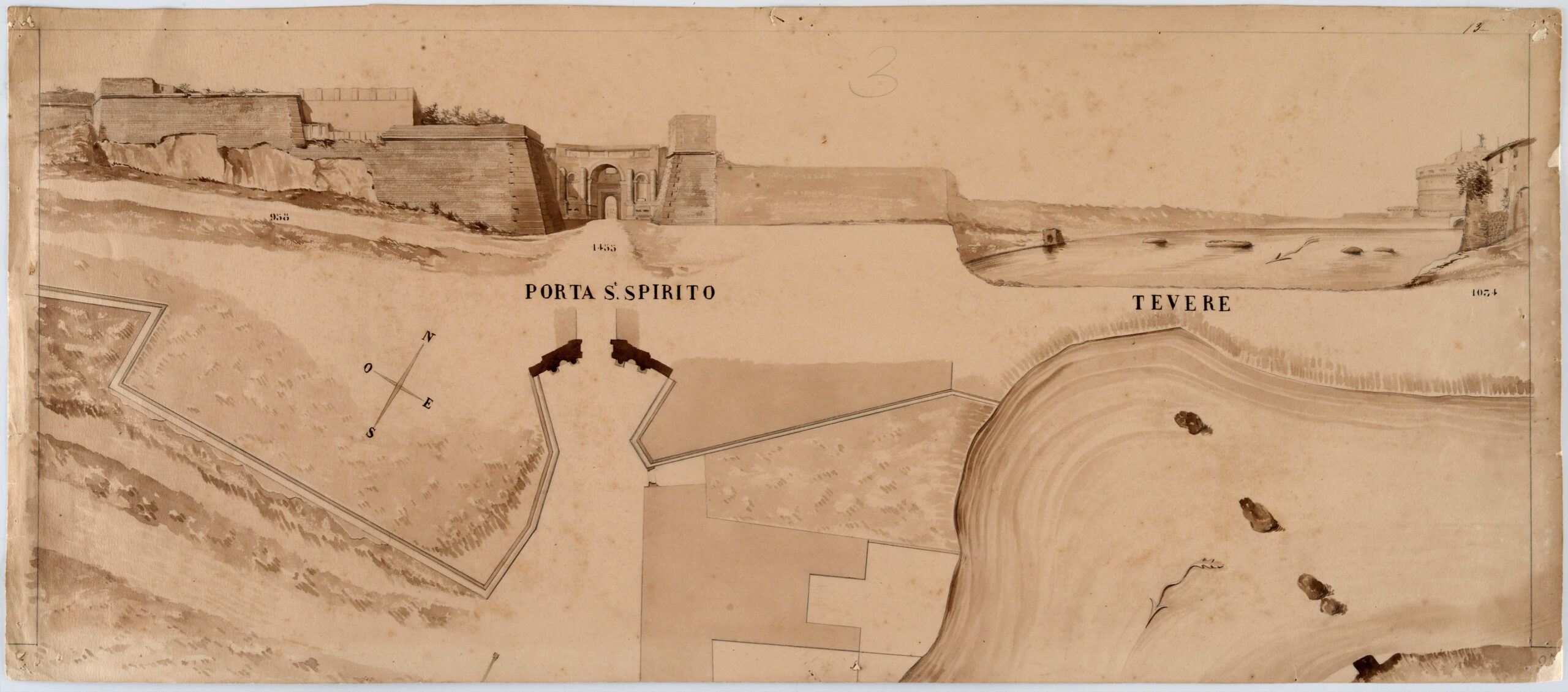 3. Borgo Santo Spirito: elevation of the gate and of the Ospedale Santo Spirito, first half of the 19th century, drawing.