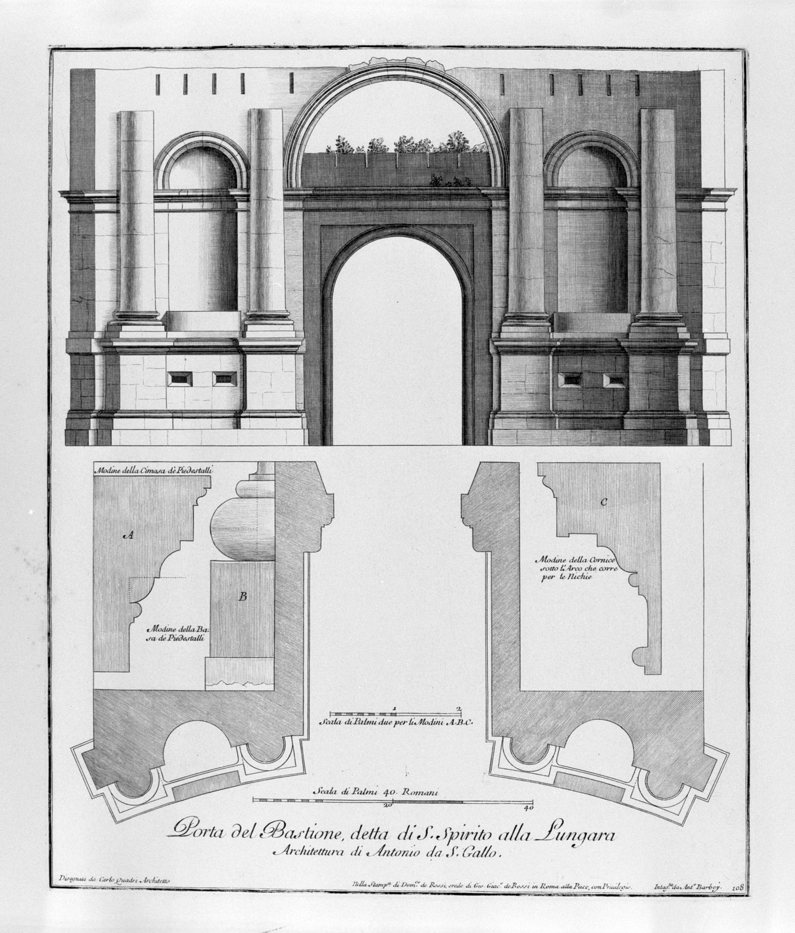 2. Plan and elevation of Porta Santo Spirito, beginning of the 18th century, print.