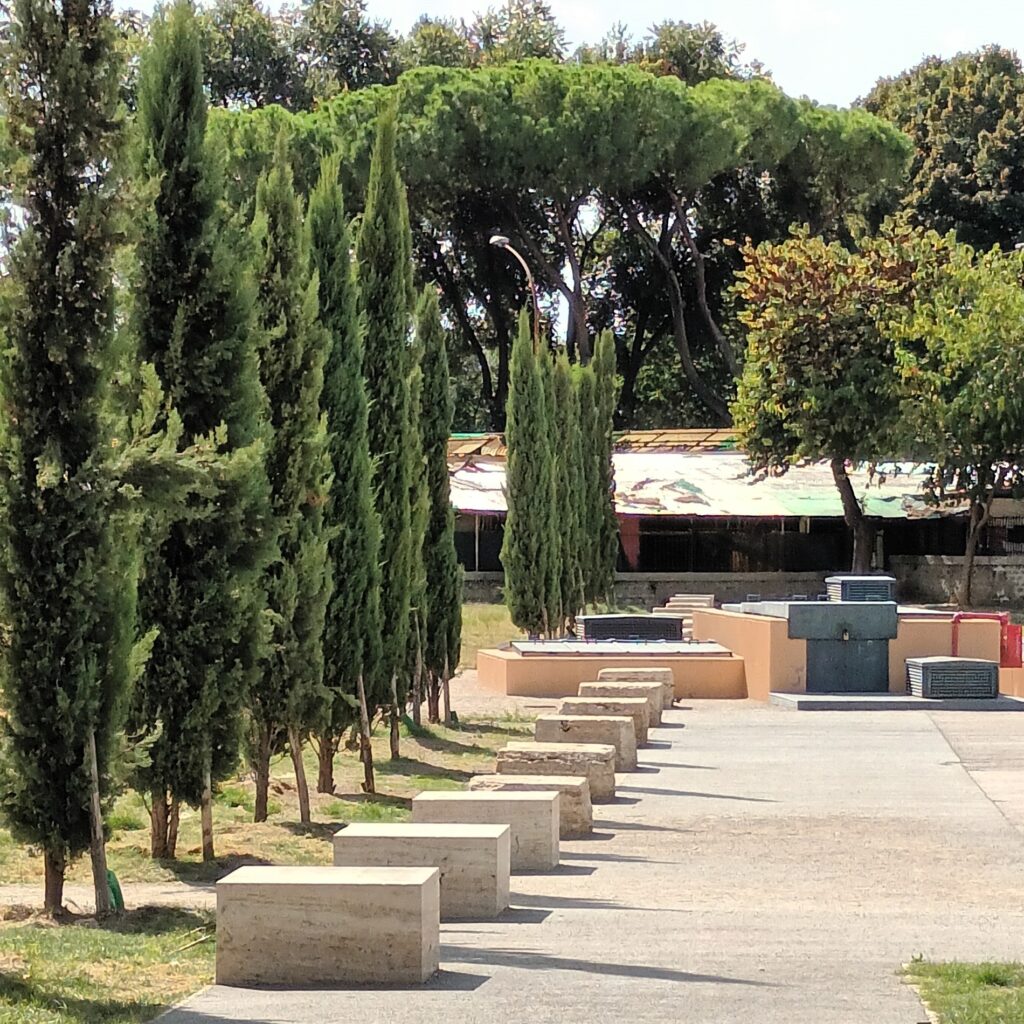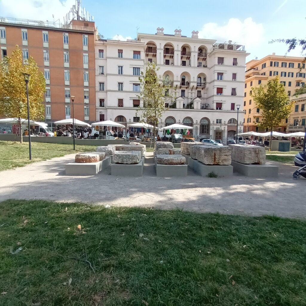 Along Via Sannio, in 2020, the eponymous gardens were restored in an area long used for the Metro C construction site. Excavations uncovered an imposing portico built under Emperor Claudius around the mid-1st century CE, abandoned and buried by 80 CE. The colonnade opened onto a gently sloping garden leading to a watercourse. The structure likely belonged to a wealthy residence arranged on terraced levels. Column bases in travertine blocks and the back wall, behind which a channel collected rainwater from the Lateran Hill, were preserved. The footprint of the ancient portico is suggested in the gardens by travertine blocks and cypress trees.