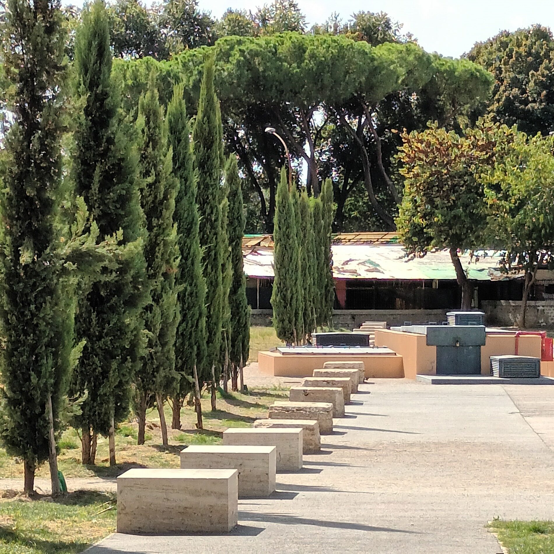 Along Via Sannio, in 2020, the eponymous gardens were restored in an area long used for the Metro C construction site. Excavations uncovered an imposing portico built under Emperor Claudius around the mid-1st century CE, abandoned and buried by 80 CE. The colonnade opened onto a gently sloping garden leading to a watercourse. The structure likely belonged to a wealthy residence arranged on terraced levels. Column bases in travertine blocks and the back wall, behind which a channel collected rainwater from the Lateran Hill, were preserved. The footprint of the ancient portico is suggested in the gardens by travertine blocks and cypress trees.