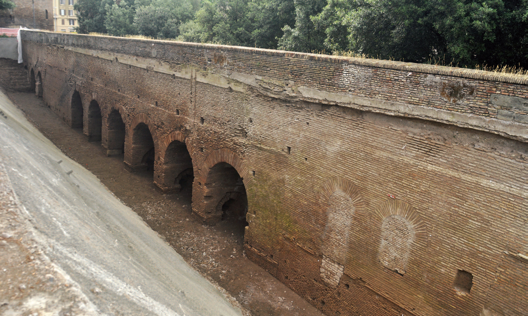Excavations for Metro C allowed the recovery of about 80 meters of the inner wall, previously obliterated by post-ancient fill. This stretch includes two towers and fourteen arches of the walkway, showing two construction phases, Aurelian and Honorian, with interesting late medieval functional adaptations, evidenced by painted remains and the Savelli coat of arms, possibly related to a Christian place of worship. Hydraulic structures embedded in the walkway document agricultural activities carried out until the 18th century in gardens owned by the Lateran basilica. The area is subject to enhancement interventions funded by PNRR, which will allow public access.