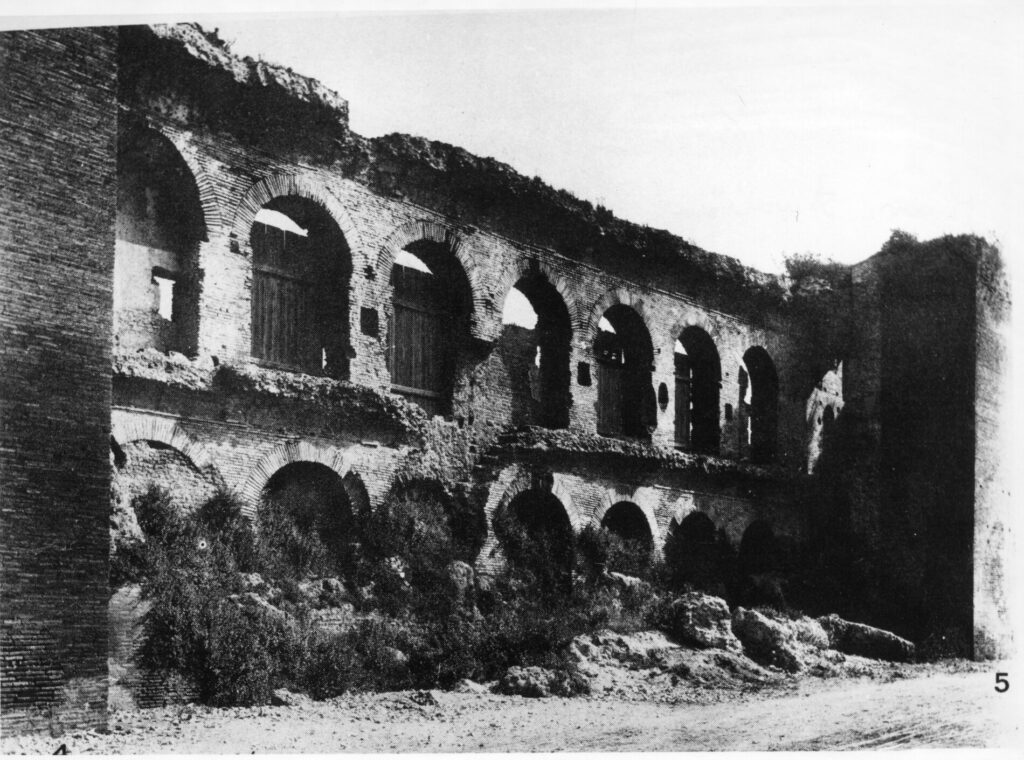For a stretch of about 60 m along today’s Via Carlo Felice Park, the wall originally stood in an existing natural hollow, which Aurelian’s architects decided to bypass with a covered double row of arches, an almost unique feature in the entire length of the fortification. In this sector, the walls were therefore higher and had a double covered walkway, instead of the full base with a patrol walkway that was the norm in Aurelian times. The basin or hollow was then filled in on several occasions over time. The infilling and the double row of arches were the main reasons for the weakening of the wall, which sustained damage several times and two major collapses between the late 19th and early 20th century. In the early 20th century, the municipal tramway company, which was granted the space in the inner garden, had part of the collapsed wall rebuilt, while in the remaining part, the Capitoline administration had the arches filled in and reinforced the wall that remained standing with the still visible tuff buttresses.