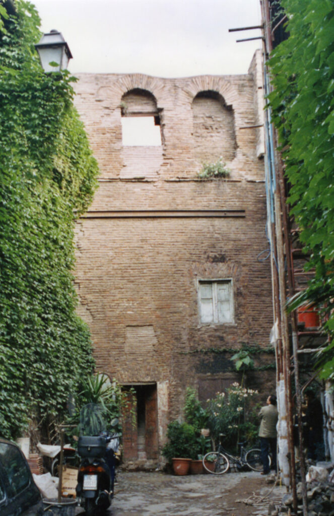 From Vicolo Moroni it is possible to see the interior front of the first of the two preserved towers of the Aurelian Wall. The structure, preserved up to the height of the second-floor chamber, still has the three windows of the upper chamber clearly recognisable on the south side. The tower was heavily damaged by modern uses that have altered the interior layout and it cannot be visited at present.