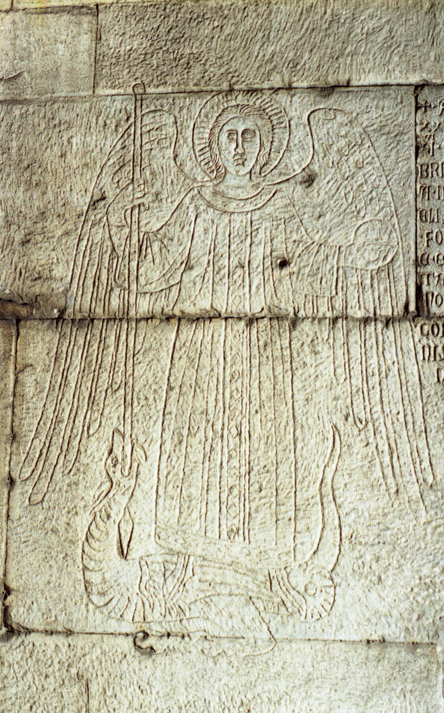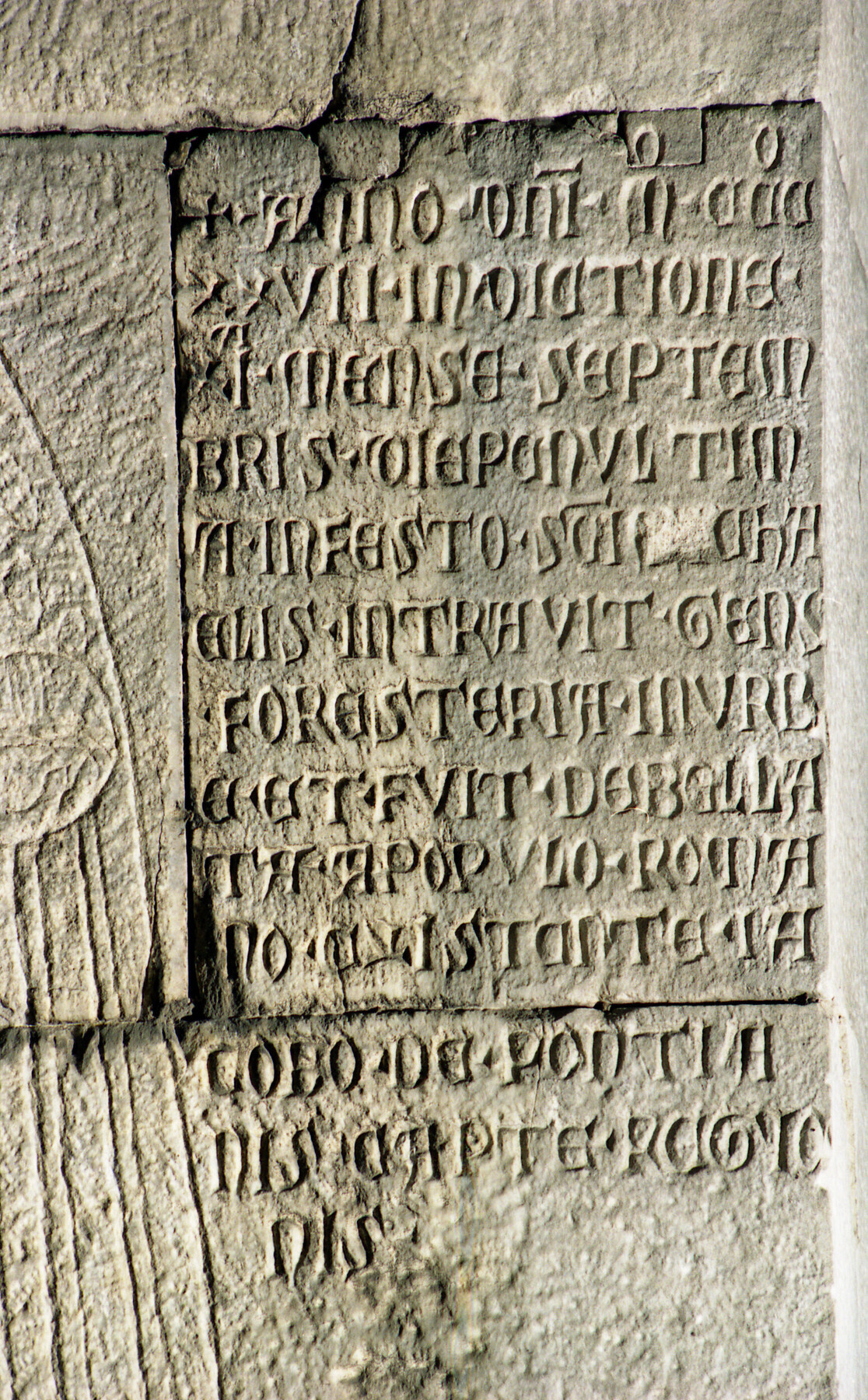 Sullo stipite interno del passaggio è incisa in caratteri gotici un’iscrizione in latino che ricorda lo scontro tra le milizie romane ghibelline dei Colonna, guidate da Giacomo de’ Pontani (o Ponziano), e l’esercito guelfo del re di Napoli Roberto d’Angiò, comandato da Giovanni e Gaetano Orsini. Lo scontro avvenne il 29 settembre del 1327, nel giorno in cui si festeggia l’Arcangelo Michele, che è raffigurato accanto all’iscrizione nell’atto di sottomettere il drago. Il testo ricorda l’insperata vittoria ghibellina e, dunque, la salvezza dal dominio straniero: «L’anno 1327, indizione XI, nel mese di settembre, il penultimo giorno, festa di S. Michele, entrò gente straniera in città e fu sconfitta dal popolo romano, essendo Jacopo de’ Ponziani capo del rione».