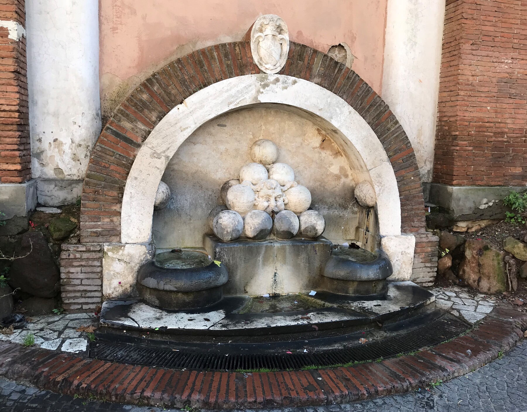 La fontana di Porta Castello sulle Mura Leonine, detta anche “delle palle di cannone”, fu realizzata nel 1927 dall’architetto Pietro Lombardi (1894-1984) e commissionata dall’Ufficio delle Antichità e Belle Arti del Governatorato. Originariamente addossata alle mura, sul lato interno, a destra del fornice di porta Castello, in seguito all’attuazione del piano urbanistico di Borgo (1936-1950) e alle demolizioni delle costruzioni addossate al Passetto, la fontana fu smontata e ricostruita con alcune modifiche nel luogo attuale, addossata al muro di cinta dell’Istituto Pio IX.