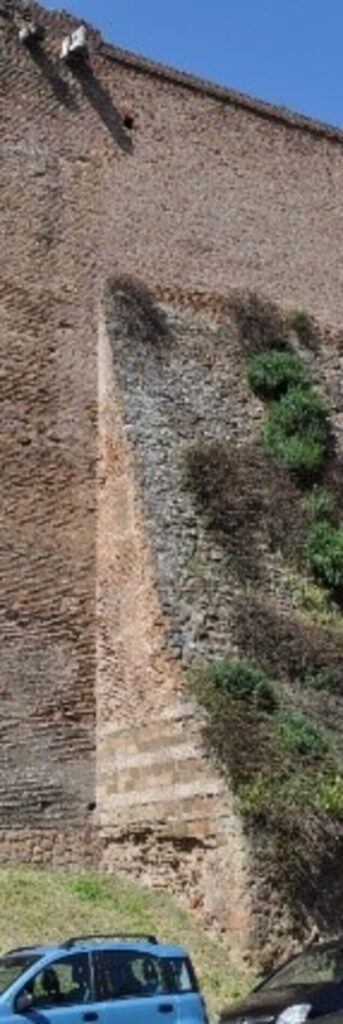 In alto si vedono due mensole di travertino sporgenti dalla muratura, utili a sostenere un necessarium, ovvero una latrina funzionale ai bisogni dei soldati di stanza nella torre o di guardia lungo il camminamento coperto. Queste strutture si trovavano infatti all’esterno delle Mura nel punto di passaggio tra torre e camminamento, generalmente occupato da un piccolo ambiente (protiro) rivolto verso il nemico e coperto a volta, utile anche per allontanare l’acqua piovana. Quasi tutti i necessaria (registrati da un documento del IX secolo, il manoscritto anonimo di Einsiedeln) sono caduti, mentre in più punti delle mura rimangono le mensole che li sostenevano.