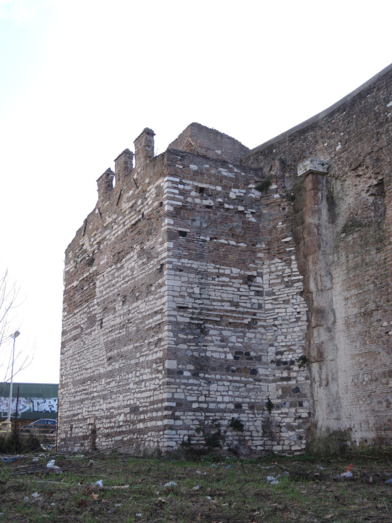 All’incrocio tra via Casilina e viale Castrense si trova la torre più singolare dell’intero settore, rivestita tra il XII e il XIII secolo con filari di laterizi, blocchetti di tufo, peperino e selce, oltre a frammenti di marmo e travertino di cui alcuni lavorati pertinenti a sarcofagi e lastre decorate. In un documento del 966 la torre viene denominata turris castellum forse in riferimento al fatto che fungesse in quest’epoca come castello di distribuzione dell’acquedotto. Nel 1720 veniva descritta come torrione grande e castello dell’acqua antica. Alla metà dell’Ottocento vi fu addossato un casotto con camino adibito a osteria. Infine durante la seconda guerra mondiale l’interno fu utilizzato come rifugio antiaereo.