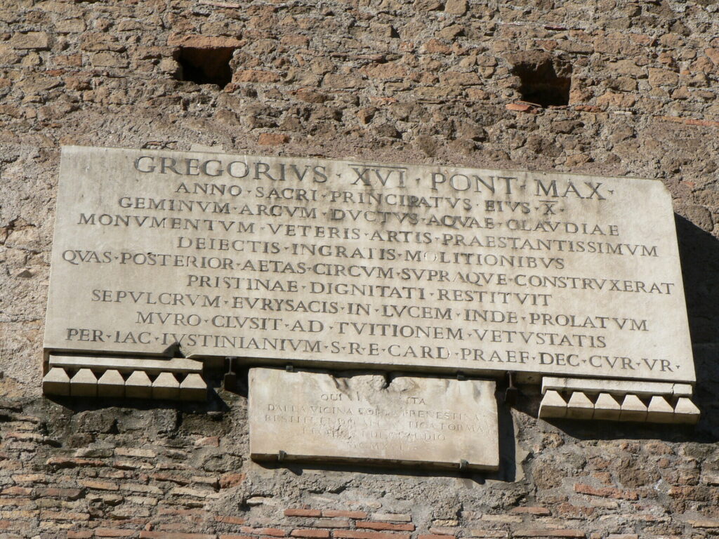La lapide, con un’iscrizione scarsamente leggibile, recava in origine la seguente dicitura: S.P.Q.R./QUI TRASFERITA DALLA VICINA PORTA PRENESTINA/RESTITUENDO ALL’ANTICA FORMA/I FORNICI DI CLAUDIO/MCMXVI.