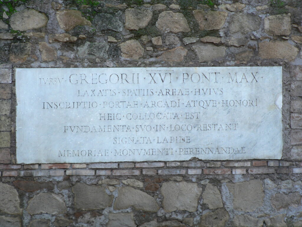Nella medesima circostanza Gregorio XVI fece apporre una seconda iscrizione in onore degli imperatori Arcadio e Onorio, che agli inizi del V secolo avevano ricostruito la porta nella sede attuale, conservando le fondazioni della struttura precedente. La lastra con l’iscrizione rubricata in nero, si trova in piazzale Labicano, inserita nel tratto di Mura Aureliane a sinistra di porta Maggiore ad un’altezza da terra di circa 65 centimetri.