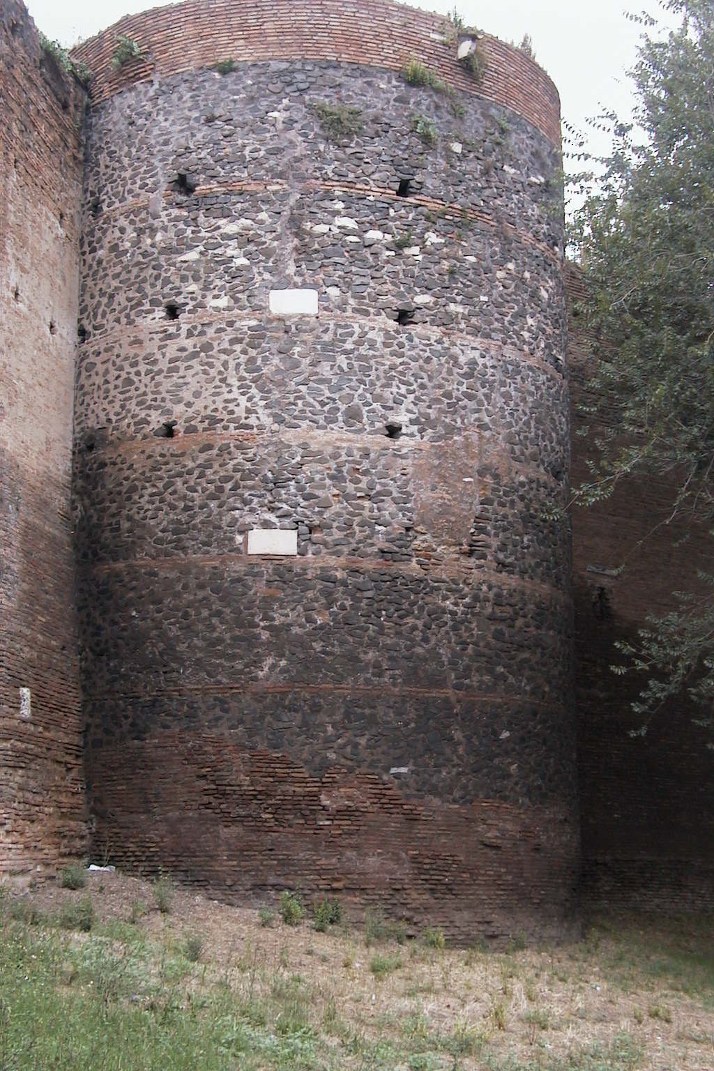 La prima torre dopo Porta Latina è a pianta semicircolare. Costruita con muratura a scaglie di selce alternata a filari di mattoni, la torre sostituisce l’antica costruzione di età romana e può essere datata in età medievale.