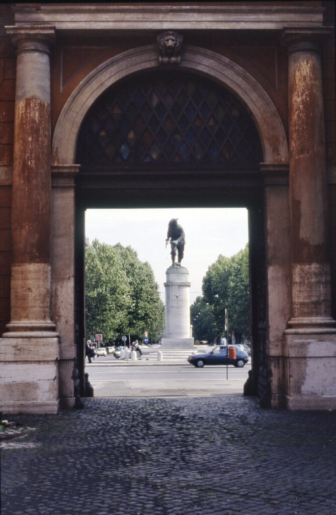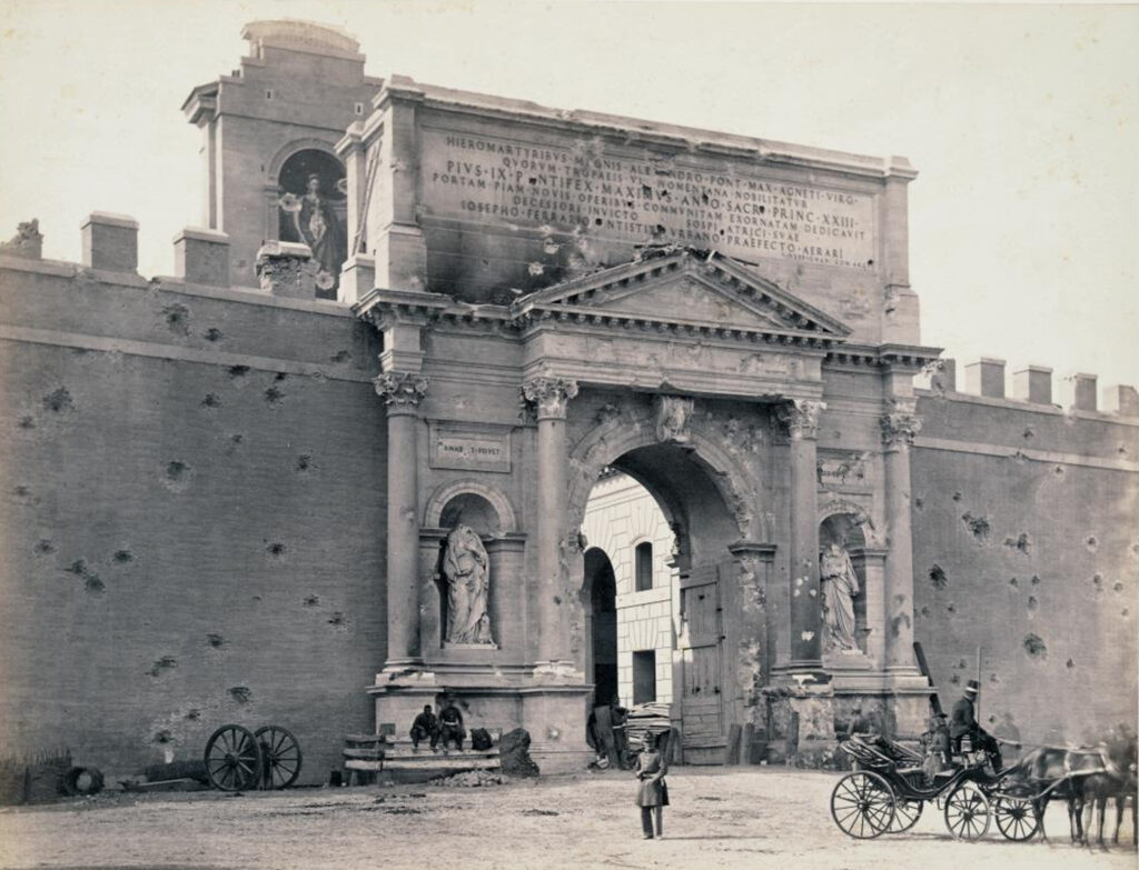 Sulla destra di Porta del Popolo, lungo piazzale Flaminio, è collocata un’imponente lapide, sovrastata da uno stemma monumentale, sulla quale si legge.