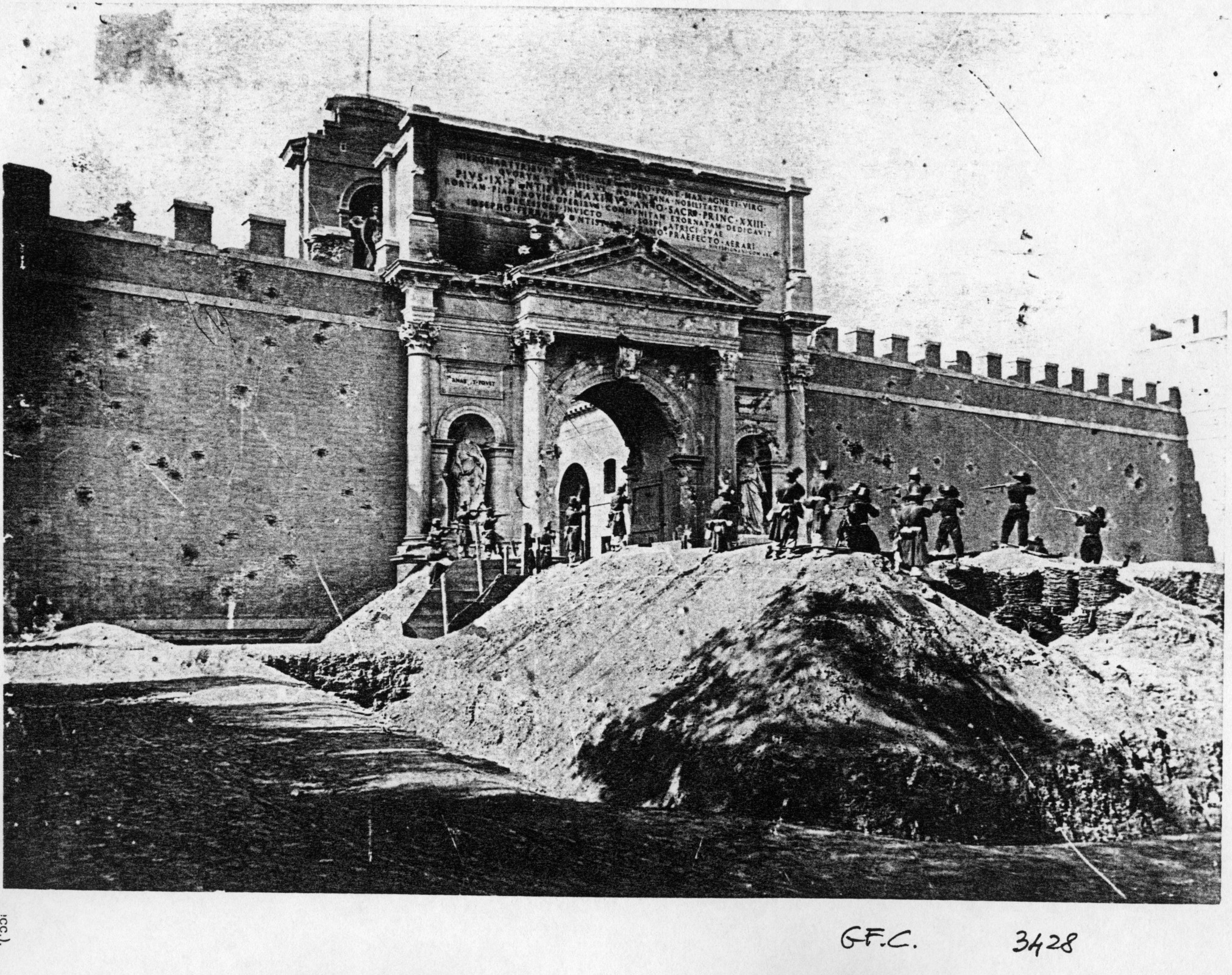 Sulla destra di Porta del Popolo, lungo piazzale Flaminio, è collocata un’imponente lapide, sovrastata da uno stemma monumentale, sulla quale si legge.