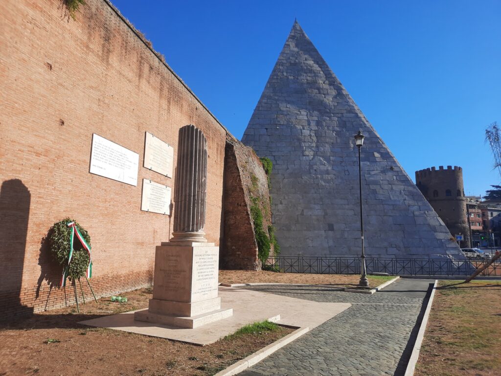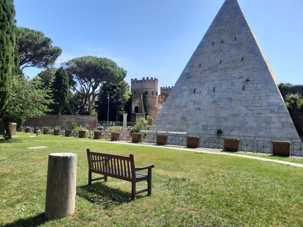Sepolcro a forma di piramide di Caio Cestio, membro del Collegio dei septemviri epulones (organizzatori dei banchetti pubblici). Testimonianza della moda egittizzante diffusasi con la conquista dell’Egitto (30 a.C.), fu costruito tra il 18 e il 12 a.C. in meno di 330 giorni per mandato testamentario. Erano presenti anche due sculture bronzee, finanziate con la vendita degli Attalica, preziose stoffe intessute d’oro, con le quali il committente voleva essere seppellito. La volontà del defunto non poté tuttavia essere esaudita, a seguito della promulgazione nel 18 a.C. della lex Iulia sumptuaria che proibì l’ostentazione del lusso.
