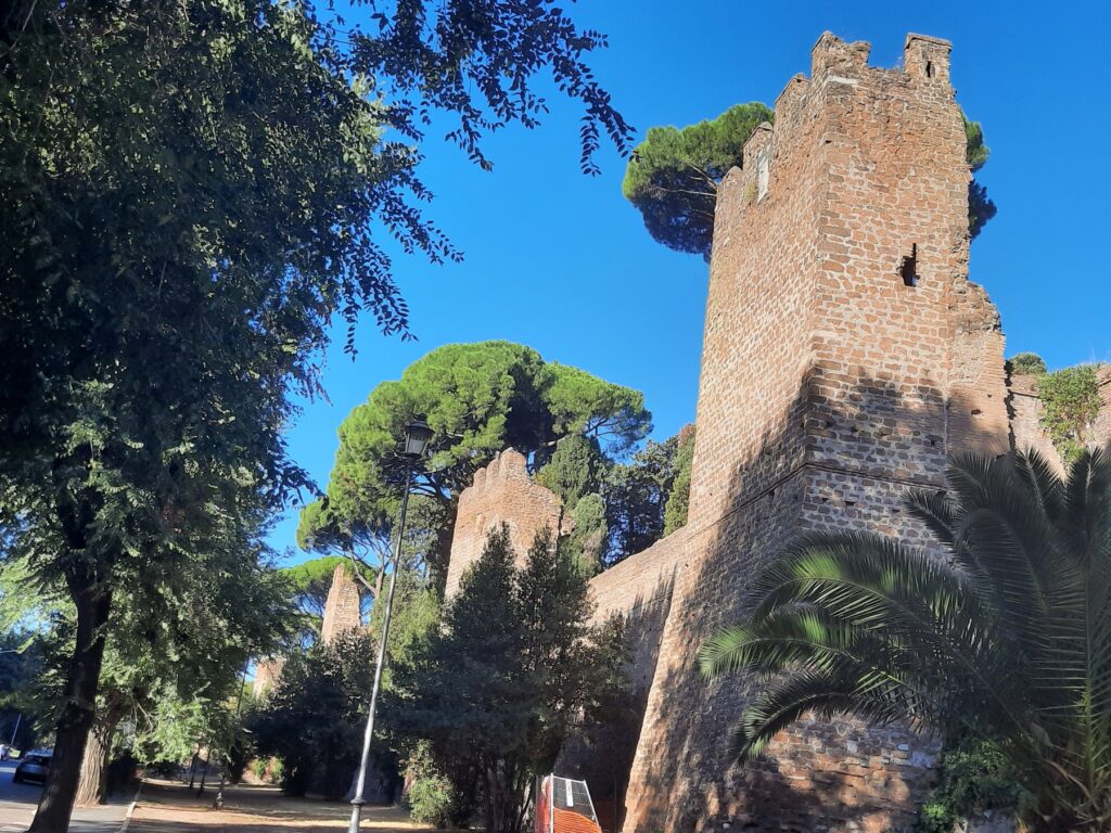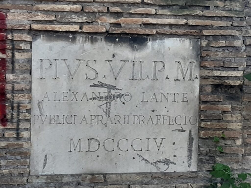 Murata sul braccio che collegava le mura al Tevere, la lapide, posta dal tesoriere pontificio Alessandro Lante, si trova nel tratto di muro, oggi gravemente compromesso, che collega la cinta al Tevere. Il testo dell’iscrizione, in caratteri capitali, è il seguente: Pius VII P M /Alexandro Lante / Publici Aerarii Praefecto / MDCCCIV.