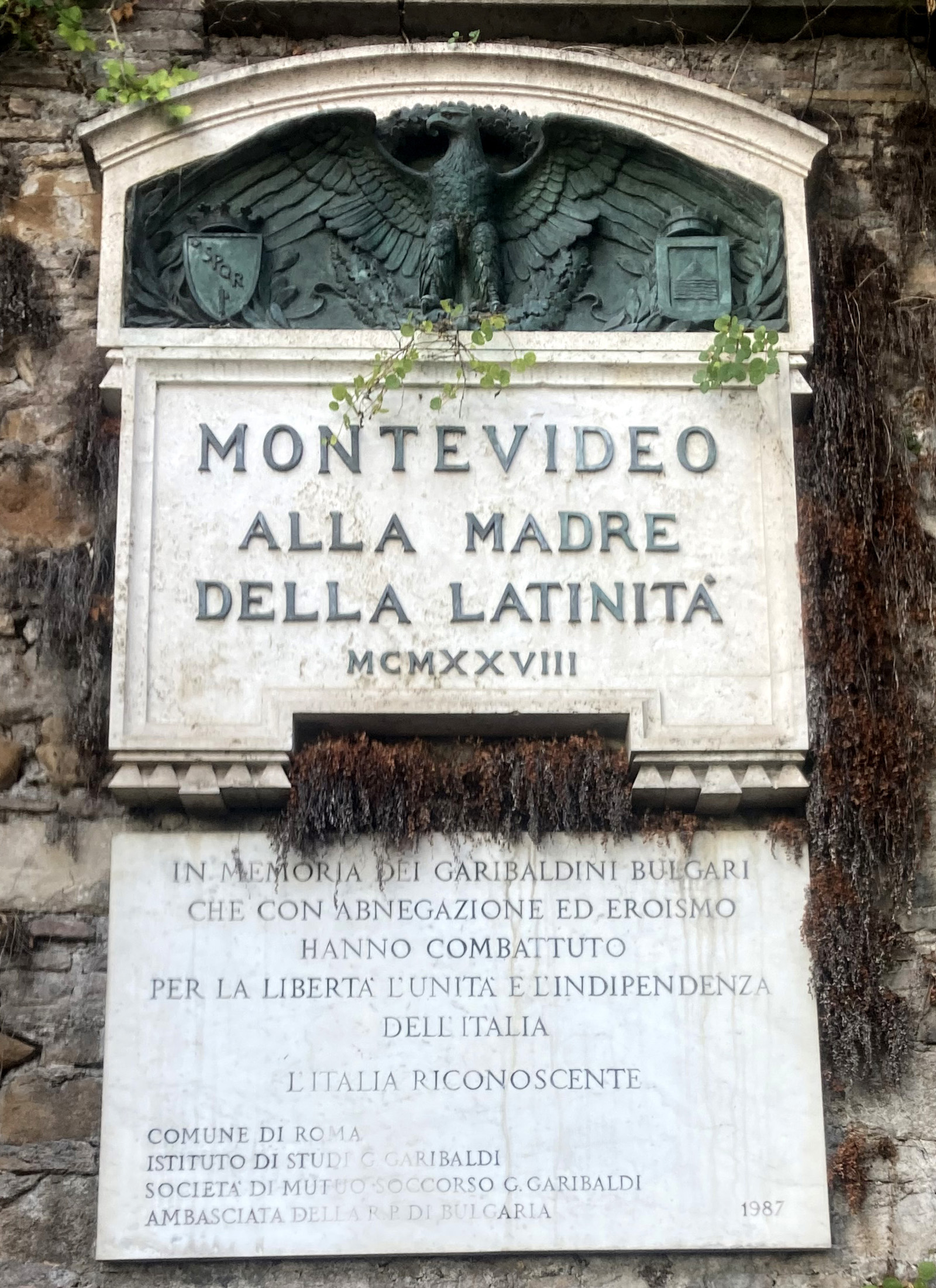 In quella più in alto un’iscrizione in bronzo, apposta nel 1928, recita: MONTEVIDEO/ALLA MADRE/DELLA LATINITA’/MCMXXVIII e vuole ricordare lo stretto legame tra la città uruguayana e Giuseppe Garibaldi che sul Gianicolo fu tra i protagonisti della difesa della Repubblica Romana nel 1849.